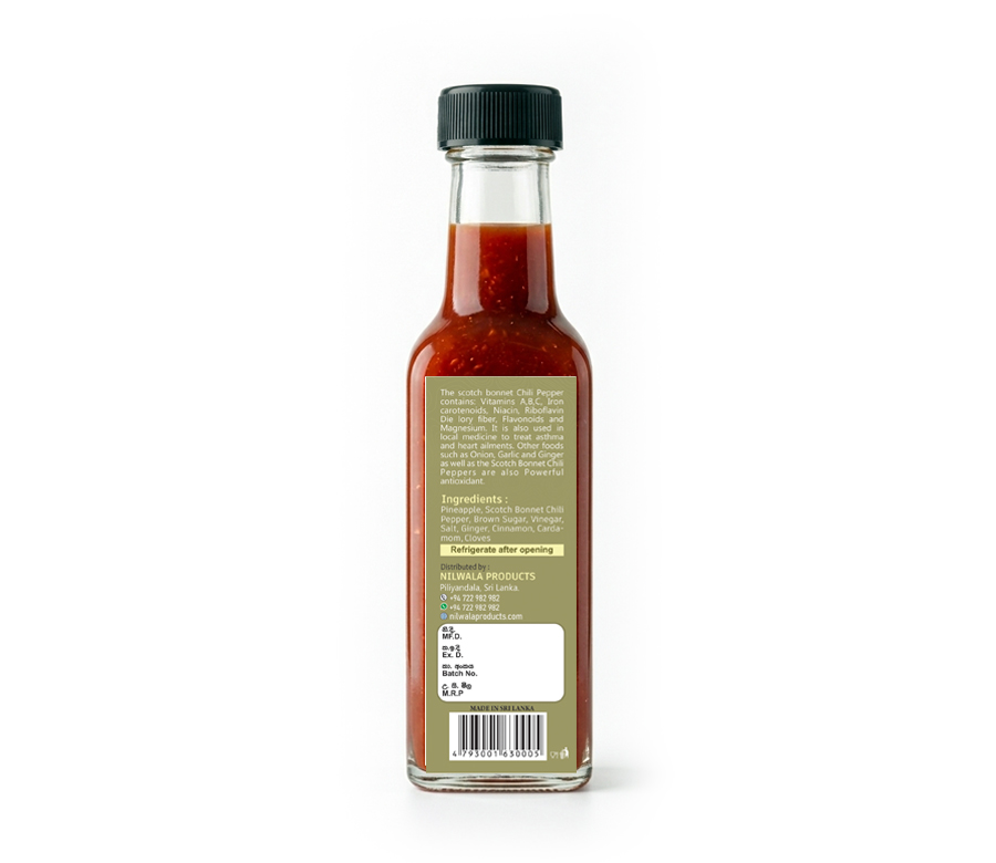 Perfect for grilling, marinating, or adding a spicy twist to your favorite dishes, Nilwala Pineapple Hot Sauce delivers a delicious and health-conscious choice with no artificial sweeteners, pigments, or preservatives.